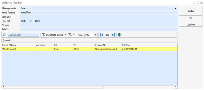 Die übrigen Felder der Eingabemaske dienen zur Eingrenzung der Suche. Durch Klick auf den Button Suche wird die Abfrage gestartet und es werden im untern Teil der Ansicht die Treffer aus der gewählten Abfragequelle angezeigt. Wird einer der angezeigten Suchtreffer markiert und anschliessend auf OK geklickt, so werden die ausgewählten Adressdaten in die Details des in der Adressansicht markierten Datensatzes oder (bei geöffnetem Adressdatensatz) in die entsprechenden Felder übertragen. |