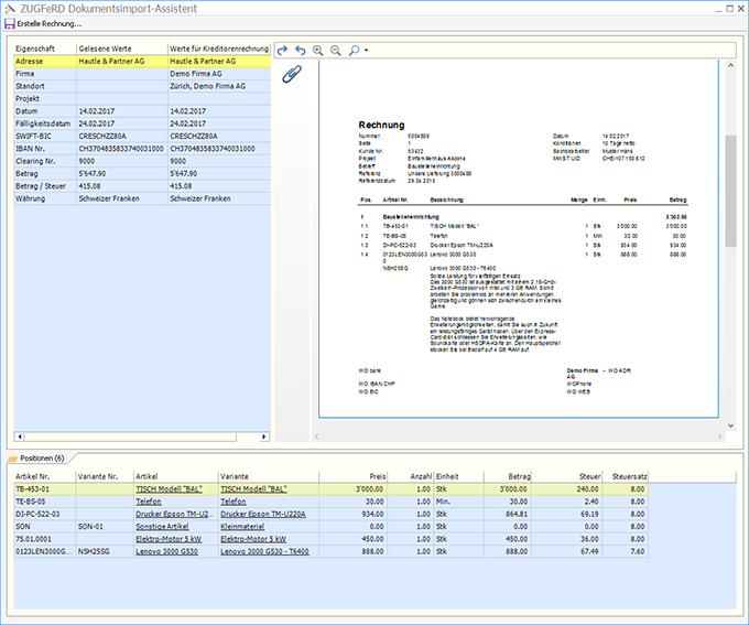 Unter der Tabelle mit den Kopfdaten sowie der PDF Vorschau befindet sich eine Tabelle, in welcher die Positionen des Dokuments angezeigt werden, wie sie in die Kreditorenrechnung übernommen werden. Zwei Szenarien werden dabei unterstützt: