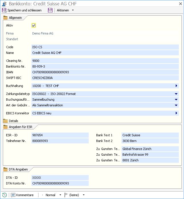 Das Objekt Bankkonto dient der Verwaltung von Stammdaten im Zusammenhang mit dem Zahlungsverkehr. Somit gehört das Bankkonto zu den Angaben, welche in Rechnungen eingesetzt werden, um ESR Einzahlungsscheine korrekt zu bedrucken. Auch sorgen die Informationen des Objektes dafür, dass in den Debitoren eingehende Zahlungen automatisch verbucht rep. dass in den Kreditoren Zahlungsaufträge abgewicket werden können.